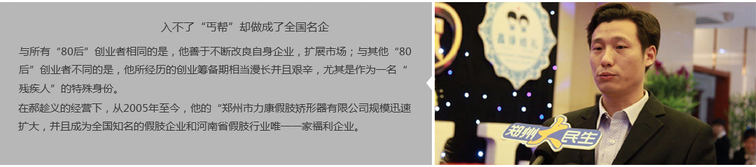 鄭州市力康假肢矯形器有限公司(簡稱力康),是一家專業從事假肢矯形器的設計、研發(fā)、制作及裝 配的專業機構。成立于1992年是河南省唯一一家福利企業。力康下設業務部、技術部、住院部、康復 部、售后服務部,并配有現代化的裝配車間和功能齊全的訓練大廳,為殘疾朋友康復訓練提供了可靠 保障。總經理穿戴假肢多年,有著豐富的臨床經驗和親身體會;多年來,力康已為全國幾十萬名殘疾 朋友安裝上舒適、美觀、耐用的假肢和矯形器具,使他們更大限度地恢復了正常的工作和生活。“產 品即人品”的質量理念、先進的技術、實惠的價格、完善的售后服務是力康取勝的法寶……